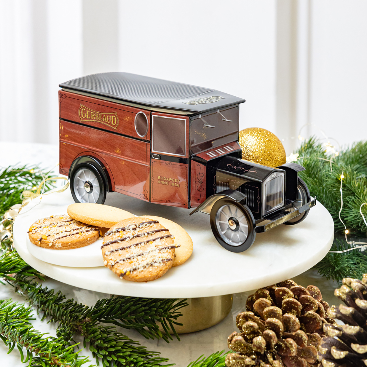 Order our charming combination of heritage and homemade delights — a vintage-inspired mini Gerbeaud car filled with delicious vanilla-almond and dark chocolate biscuits!
