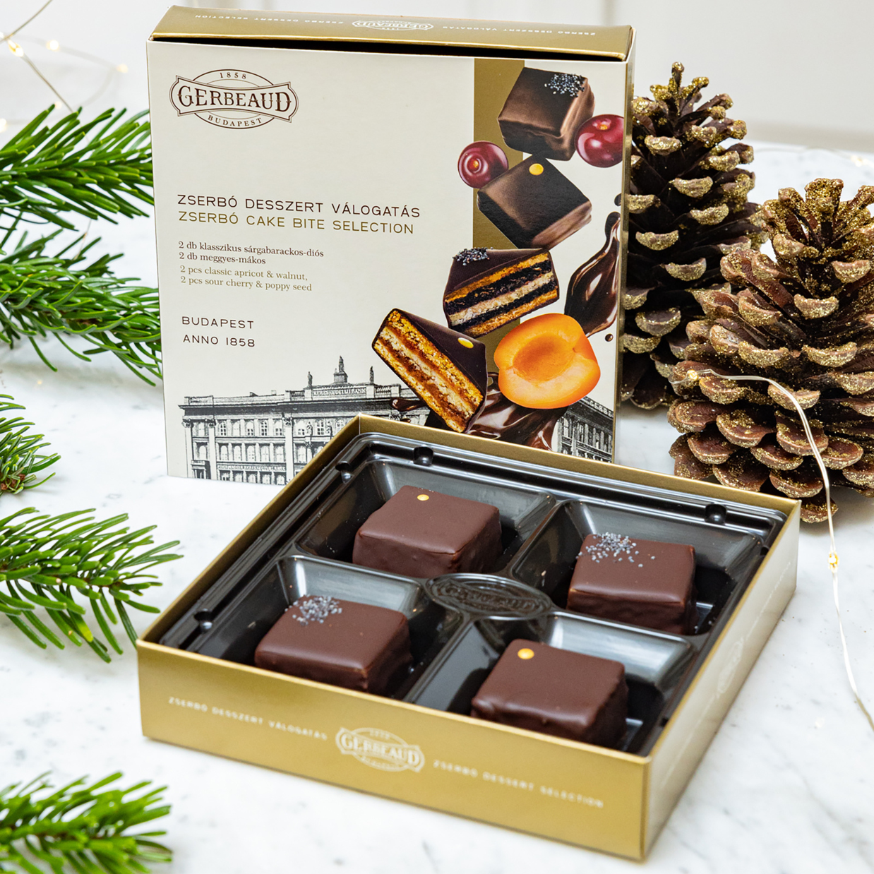 The gift box contains 4 pieces of Zserbó cake bites, 2 in the classic apricot-walnut and 2 in the sour cherry-poppy seed flavour, guaranteeing the usual quality and nostalgic moments.