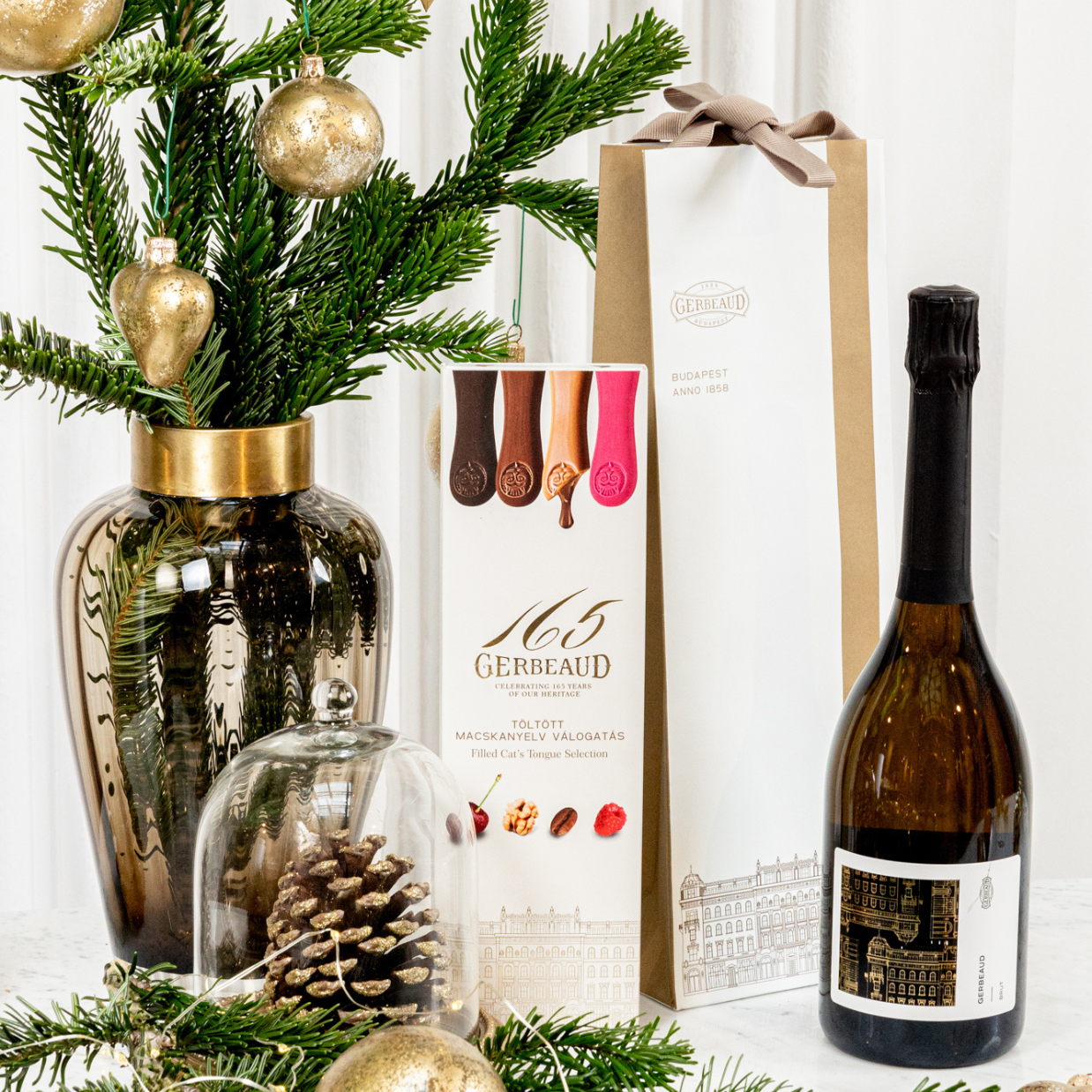 In the exclusive gift package of Gerbeaud Cat's tongue & Bubbles: the refreshing, citrusy notes of Gerbeaud Brut Sauska sparkling wine harmonise perfectly with the sweetness of Filled Cat's tongue chocolates, dreamed up in new flavours inspired by the Café's more than 165-year heritage.